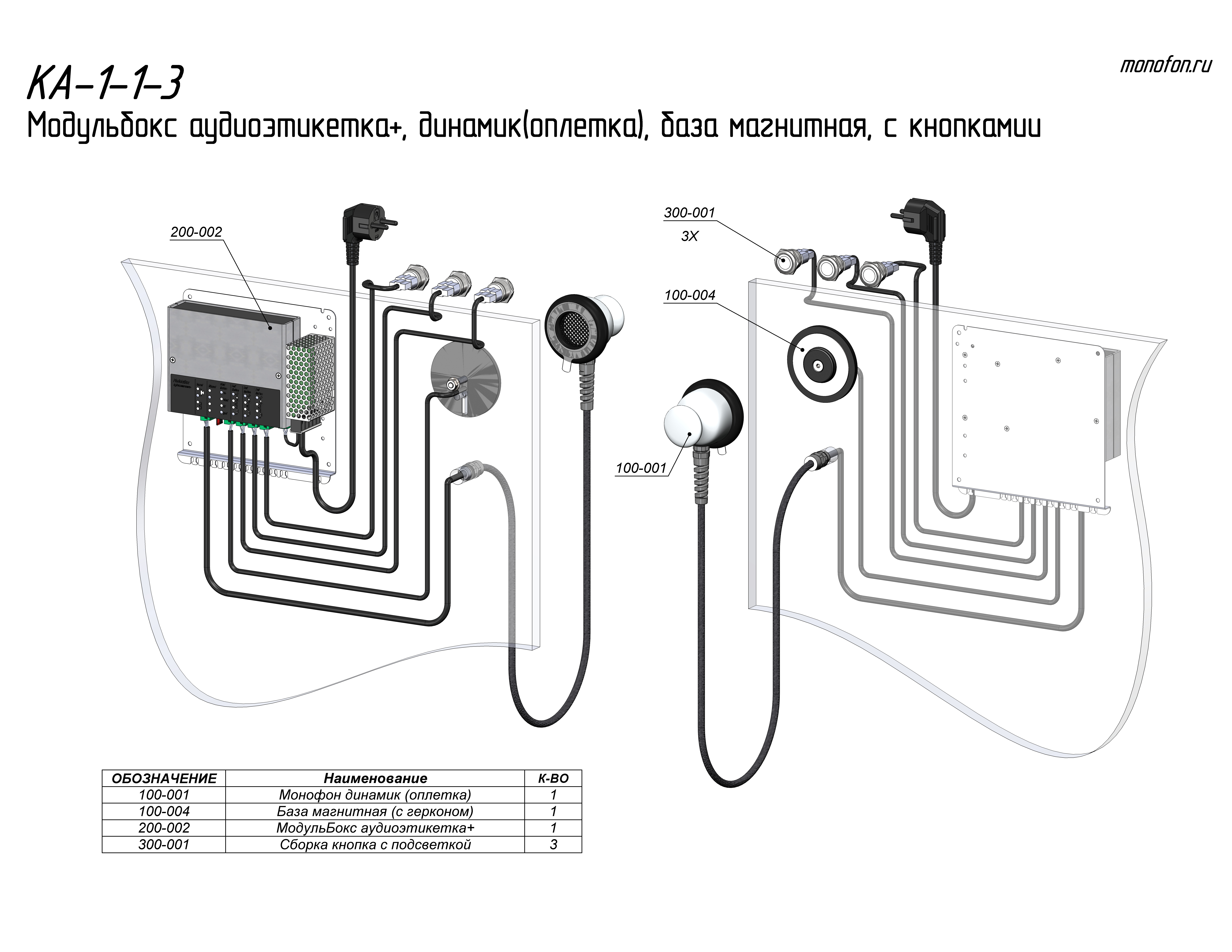 Устройство предназначено для проигрывания аудио контента, при снятии наушника с базы. C помощью кнопок может быть настроено переключение контента, например для смены языка.